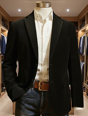 Blazer masculino de veludo com gola entalhada, estilo clássico casual para escritório, cor sólida, disponível nas cores preto, azul marinho e marrom, corte ajustado, abotoamento simples com dois