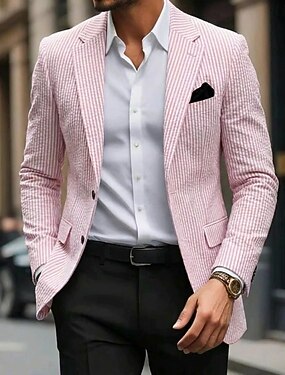Homens Jaqueta Blazer Colar de entalhe Moda Leve Clássico Listrado Blazer Ternos de seersucker Blazer de algodão seersucker Rosa Azul Céu Moderno Dois botões de peito simples