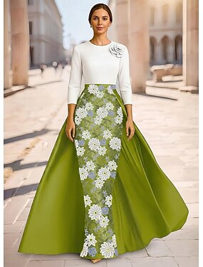 Linha A Sereia Longo Vestidos de noite Vestido de baile com sobressaia Vestido formal Elegante Manga 3/4 Gola Redonda Festa de Jardim Casamento Cetim Elástico com Flores 3D Bordado Apliques