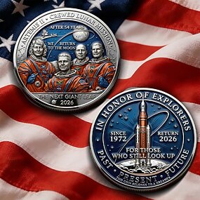 Moeda comemorativa da missão lunar Artemis II, homenagem ao retorno tripulado à Lua em 2026, astronauta &Item colecionável de foguete, lembrança histórica do programa espacial dos EUA.