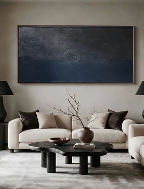 Pintura abstrata texturizada pintada à mão em acrílico preto e azul escuro, arte de parede em tela cinza, pintura abstrata azul moderna e minimalista.