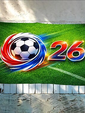 Bandeira com tema de futebol para 2026 - apresenta uma bola de futebol dinâmica com um redemoinho de cores. &"26" em fundo de grama verde, durável