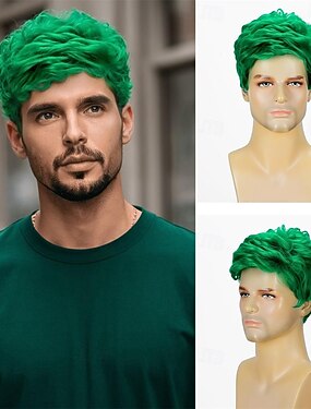 Perucas Verdes Peruca Sintética Cacheada com Franja Peruca Feita à Máquina Curta Cabelo Sintético Verde Homens Festa Natural Verde