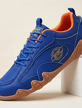 Tênis esportivo masculino com cadarço, nas cores azul e laranja, respirável e leve, ideal para treinos, atividades ao ar livre e uso casual.