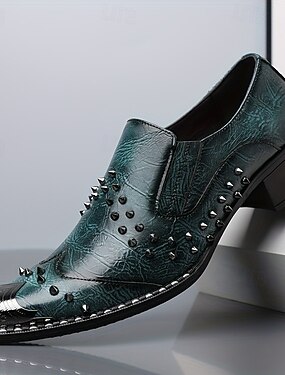 Sapatos casuais masculinos de couro sintético para casamento – estampa de crocodilo verde com tachas, calçado elegante para casamentos e celebrações especiais.