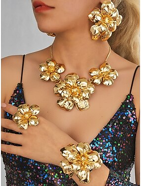 Conjunto de Joias Femininas Douradas em Tom de Ouro – Colar de Liga Brincos Pulseira e Anel para Carnaval Mardi Gras e Festa à Fantasia