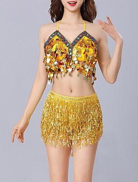 Dança do Ventre Blusa Moedas de Ouro Cor Pura Recortes Mulheres Espetáculo Treino Sem Manga Poliéster