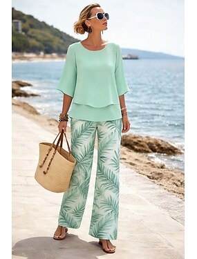 Mulheres Conjuntos de calças Meia Manga Borboleta Decote Redondo Gráfico Folhas Elegante Férias Casual Diário Praia Azul Roxo Verde Primavera Verão Ajuste Largo