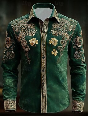 Dia de São Patrício Camisa Masculina de Trevo de Quatro Folhas Arte Celta Camisa Social Camisa de Manga Longa Vintage Retrô Férias Primavera Outono Camisa Linho Impressão 3D Verde 1 Vermelho Escuro