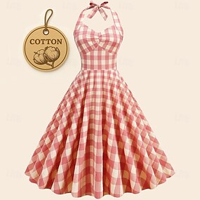 Retro Vintage Anos 50 Rockabilly Vestido swing Xadrez Guingão Linha A Halter pescoço Fantasia Mulheres Festa de Solteira Adulto Vestido Vestidos de baile Primavera Verão