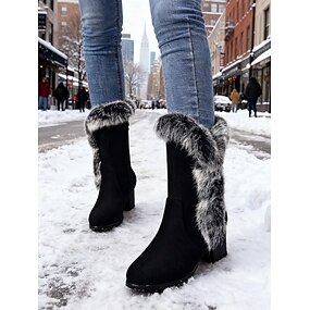 Botas de cano curto femininas em camurça preta com forro de pele sintética - salto bloco grosso com acabamento em pele sintética, estilosas e confortáveis para o inverno, uso casual e atividades ao ar