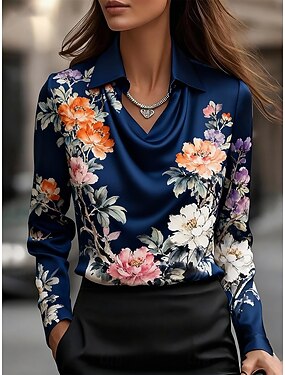 Mulheres Camisa Social Imprimir Com Pregas Floral Elegante à moda Casual Manga Longa Gola Boba Tops regulares Diário Trabalho Feriado Azul Marinha Primavera Outono