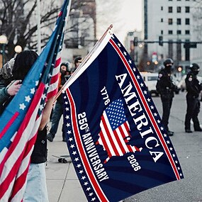 Bandeira patriótica americana do 250º aniversário dos EUA com a Estátua da Liberdade, a águia-careca, o Monte Rushmore e a Casa Branca, ideal para exibição em ambientes internos e externos.