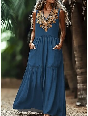 Mulheres Vestido Longo Vestido Boho Vestido floral Vintage Moda Moderno Ao ar livre Férias Para Noite Normal Floral Sem Manga Decote V Azul Verão Primavera