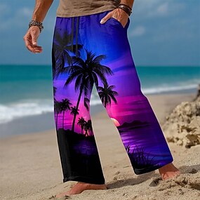 Homens Coqueiro pôr do sol Plantas Tropicais Calças Calça casual Calças largas Cintura Média Havaiana Ao ar livre Férias Roupa de Praia Cintura elástica com cordão Calças de linho com bolsos Verão