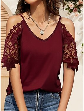 Mulheres Camisa Social Blusa Tops de renda Blusas com ombros à mostra Renda Côr Sólida à moda Clássico Moderno Manga Curta Decote V Tops regulares Diário Feriado Para Noite Vinho Verão Primavera