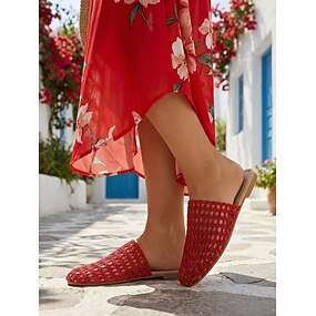 Sandálias femininas vermelhas de crochê, estilo mule, respiráveis e rasteiras, ideais para resorts ao ar livre e férias em destinos tropicais. &viagens de verão para a praia