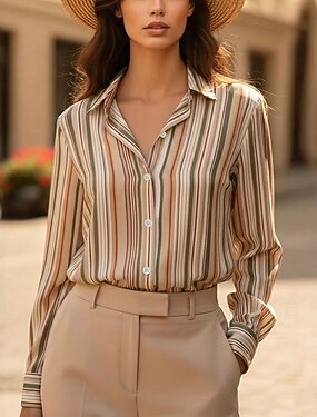 Mulheres Camisa Social Listrado Elegante Vintage Casual Manga Longa Decote V Tops regulares Casual Diário Cáqui Primavera