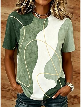 Blusas de Malha Texturizada de Waffle para Mulheres Camiseta T Shirt Estampa Ombré Gráfica Geometria Estilosa Clássica Manga Curta Gola Redonda Henley Tamanhos Regulares Diários Esportes Preto e
