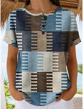 Camiseta Waffle Feminina Estampada Gráfica Geométrica Vintage Estilosa Clássica Manga Curta Gola Redonda Tamanhos Regulares Diários Azul Roxo Verde Caqui Verão Primavera