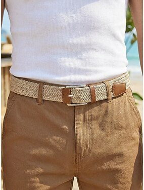 Cinto masculino trançado elástico com acabamento em couro sintético, ajustável e casual, disponível em diversas cores, ideal para uso diário, férias na praia, viagens e looks para resorts.