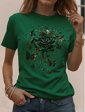 Mulheres Camiseta Imprimir Floral Gráfico Plantas à moda Clássico Casual Manga Curta Gola Redonda Decote Redondo Tops regulares Diário Preto Vermelho Verde Verão Primavera