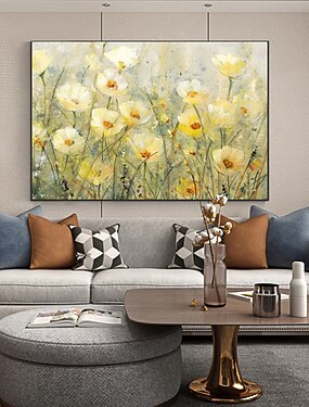 Pintura a óleo floral artesanal, tela acrílica, arte de parede, decoração, romance literário, flores amarelas para decoração de casa, pintura enrolada sem moldura e não esticada