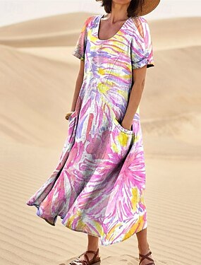 Mulheres Vestido Longo Vestido Maxi Vestido casual Vestido Swing Vestido de verão Elegante Moda Romântico Ao ar livre Festa Feriado Normal Flor Manga Curta Gola Redonda Roxo Arco-íris Vermelho Rosa