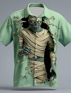 Homens Zumbis Saco Mummy Parede rachada Camisa Social camisa de botão Manga Curta Estilo gótico escuro Feriado Streetwear Verão Primavera Aberto para a Lateral Impressão 3D camisas de colarinho Verde
