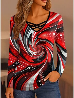 Mulheres Camiseta Com Corte Imprimir Âmbar Gráfico Geometria Vintage à moda Clássico Manga Longa Decote V Tops regulares Diário Azul Rosa Vermelho Verde Primavera Outono
