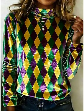 Carnaval Mulheres Túnica Camisetas Imprimir Âmbar Gráfico Geométrica Elegante Vintage Moda Manga Longa Gola Alta Tops regulares Diário Para Noite Final de semana Roxo Verde Primavera Outono Inverno
