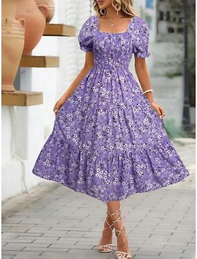 Mulheres Vestido midi Vestido casual Vestido floral Elegante Moda Moderno Ao ar livre Férias Para Noite Normal Floral Manga Curta Decote Quadrado Azul Preto Branco Rosa Verão Primavera