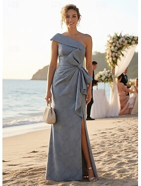 Macacão Longo Vestido com sobressaia Vestido Para Mãe dos Noivos Sem Manga Assimétrico Elegante Minimalista Formal Convidado do casamento Cetim com Laço(s)