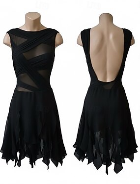 Vestido de patinação artística feminino, preto, com patchwork, barra assimétrica, elástico, para treino e competição, manga comprida.