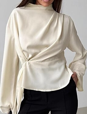 Mulheres Camisa Social Elegant Elegante Top de cetim Franzido Patchwork Com Pregas Côr Sólida Tecido Elegante Vintage Diário Manga Longa Manga lanterna Assimétrico Tops regulares Diário Trabalho