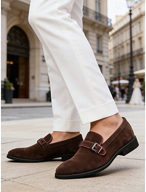 Mocassins masculinos marrons com fivela, elegantes sapatos de camurça sem fecho, perfeitos para o escritório, ocasiões semiformal e casual de negócios, sapatos sociais confortáveis para homens e casamentos.