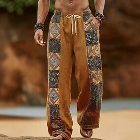 Homens Geométrica Bloco de cor Étnico Calças Calças largas Calça casual Cintura Média Boho Vintage retrô Casa Ao ar livre Férias Cintura elástica com cordão Calças de linho com bolsos Verão Primavera