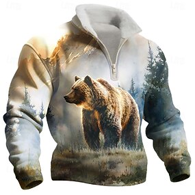 Homens Animal Urso Tosão Moletom Moda Casual 3D Colarinho Chinês Quarter Zip Ao ar livre Férias Presente Streetwear Azul Cinzento Cinza 2 Half Zip Outono Inverno Designer S M L XL XXL XXXL