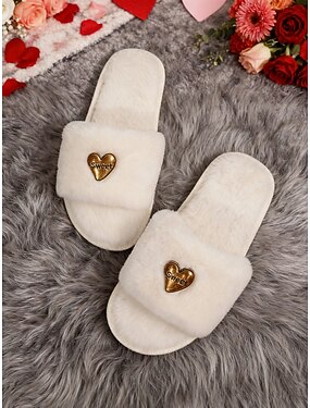 Pantufas femininas de pele sintética macia e fofa na cor cáqui com pingente de coração dourado – chinelos de pelúcia macios e abertos na frente, perfeitos para o quarto, relaxamento no spa e presentes de Dia dos Namorados.