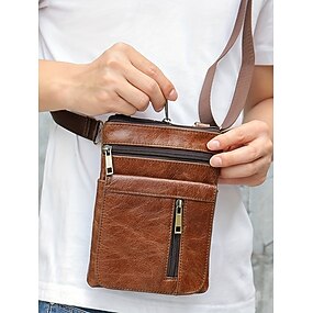 Pochete masculina em couro legítimo, transversal, para celular, em diversas cores, com grande capacidade e múltiplos bolsos. Possui alça ajustável e é ideal para uso casual diário, deslocamento para o trabalho e viagens.