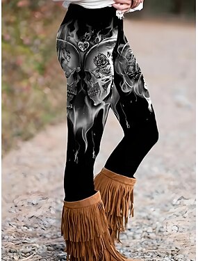 Leggings Femininas Férias Vintage Estilo Étnico Comprimento Acima do Tornozelo Cintura Alta Calças Print de Caveira 3D Secagem Rápida Respirabilidade Macio Extensível Formal Externo Férias Preto