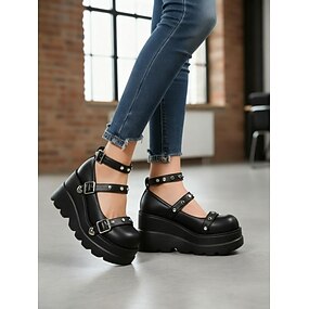Sapatos femininos mary jane plataforma pretos dos anos 80 com fivelas e tachas de coração – estilo lolita punk gótico para halloween, cosplay e saídas à noite