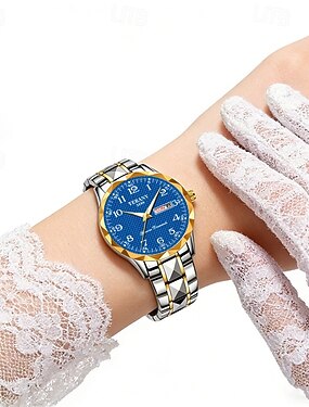 Relógio feminino de luxo, bicolor em aço inoxidável com mostrador azul e calendário com dia e data, relógio elegante e à prova d'água para ocasiões formais e informais, presente sofisticado para mãe e