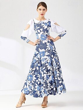 Vestido de dança de salão feminino floral com ombros à mostra, gola com babados, mangas compridas, estilo valsa, azul e branco, para competição de dança moderna e padrão.