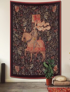 Tapeçaria de parede vintage gótica com cavaleiro medieval a cavalo, leão vermelho, bandeira e mil-folhas, arte antiga para pendurar na sala de estar, quarto, decoração de casa, presente para