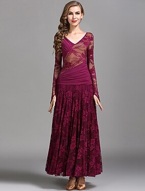 Dança de Salão Vestido Renda Pregas Mulheres Festa Treino Espetáculo Manga Longa Alto Fibra Sintética Raiom Elastano