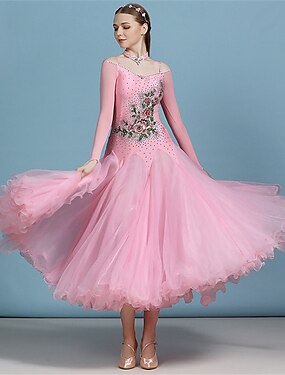 vestido de dança de salão feminino com strass floral bordado em camadas de tule elegante valsa tango foxtrote competição vestido – rosa