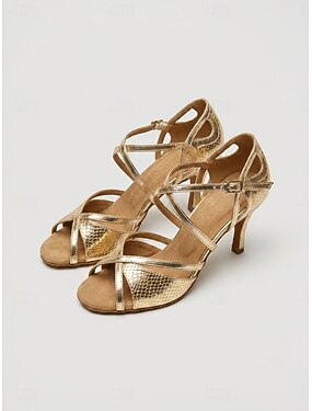 Sapatos de dança latina femininos dourados metálicos com bico aberto - sapatos de salto alto com tiras para apresentações de salsa e salão de baile.