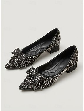 Sapatos de salto bloco pretos com strass, bico fino e detalhe de laço, elegantes e perfeitos para a mãe da noiva em casamentos ao ar livre. &eventos formais