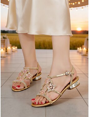 Sandálias femininas elegantes de salto baixo com estampa floral, confortáveis e com tira no tornozelo, ideais para a mãe da noiva em ocasiões rústicas. &casamentos ao ar livre no campo